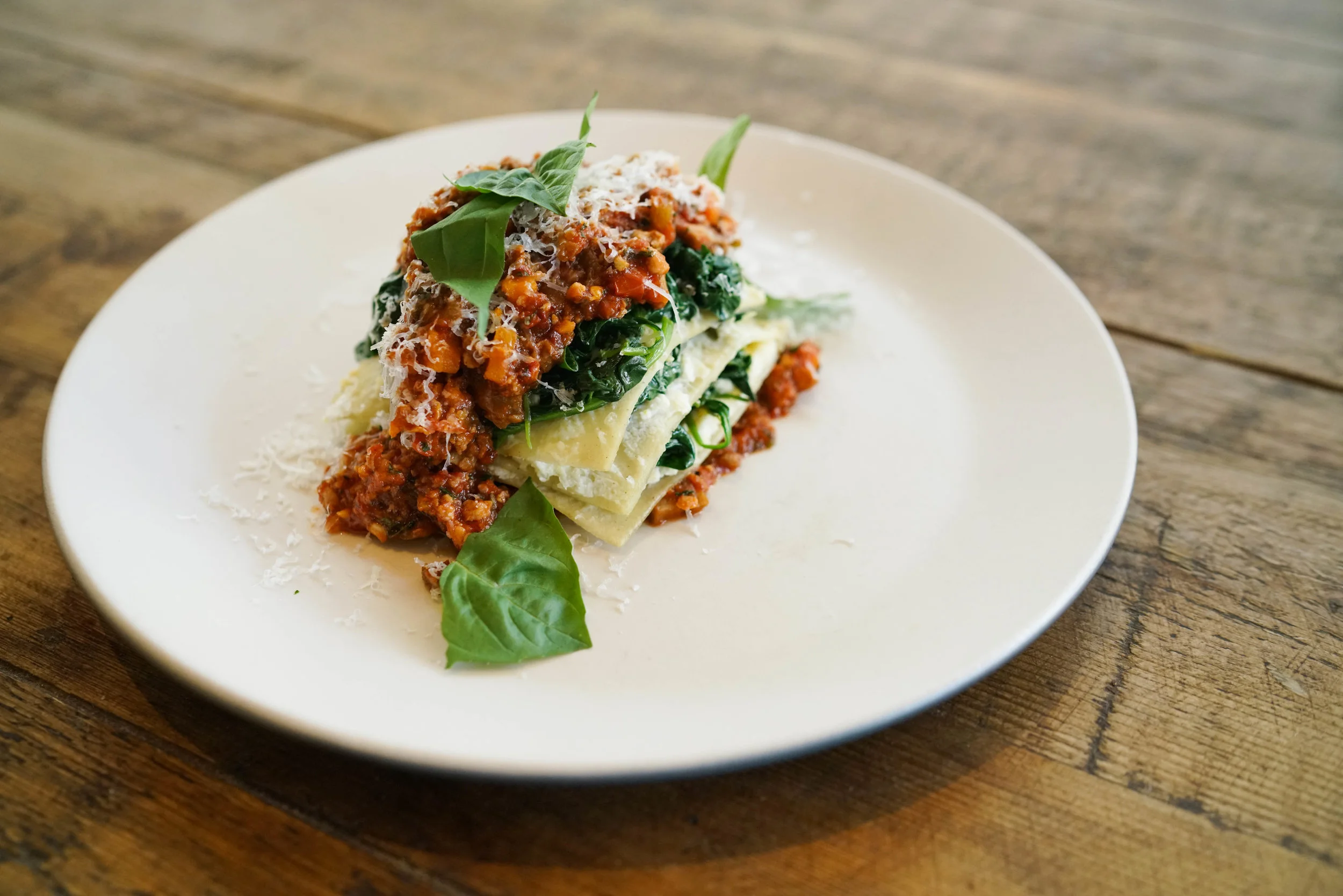 1. For single portion, spread the lemon ricotta evenly over 3 of the pasta sheets and place onto a medium size sauté pan or baking pan. Place small piles of spinach on each piece pf pasta, on top of the ricotta. Gently warm through in a 350F degree oven and make sure that the pasta does not dry out.